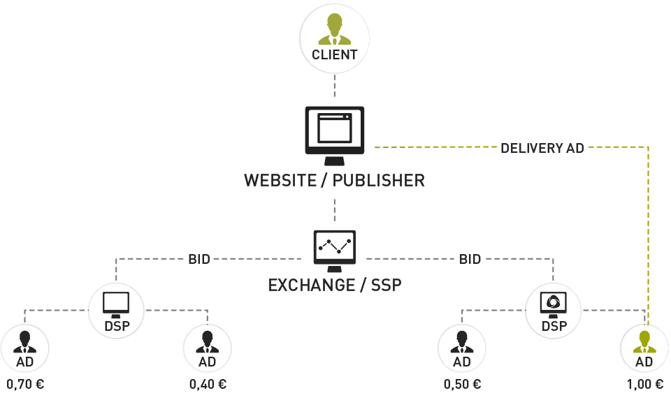 Según la IAB Spain, en su «Libro Blanco de la Compra Programática», en un proceso de RTB participan los siguientes actores: